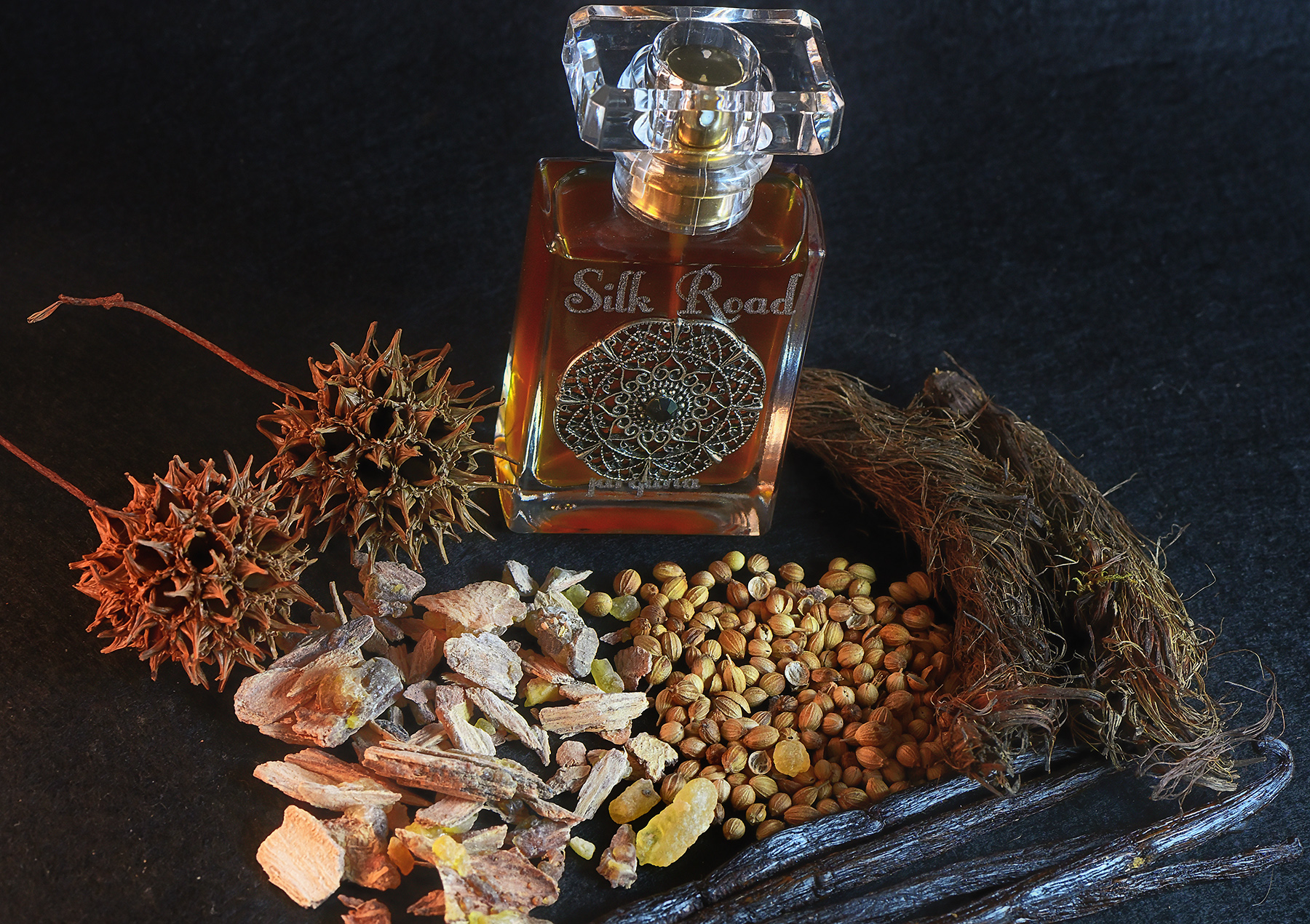 Silk Road is the first of this small line with a spicy, balsamic (from balsams), warm, woody resinous tone, but also sweetish notes made by a splendid Vanilla absolute made with Madagascar pods, always one of my export products from the big island.
